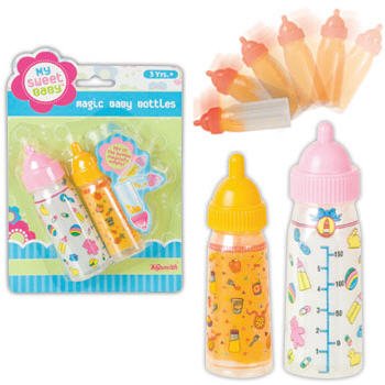This Magic Bottle set includes milk and orange juice bottles with fluid that magically disappears when tilted for feeding. Perfect accessory for you childs dolls.