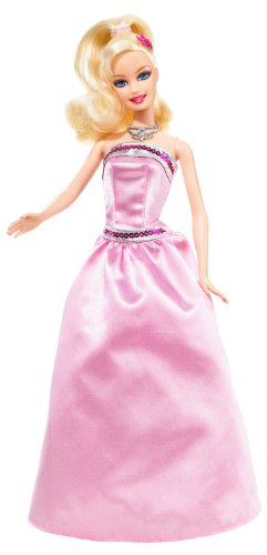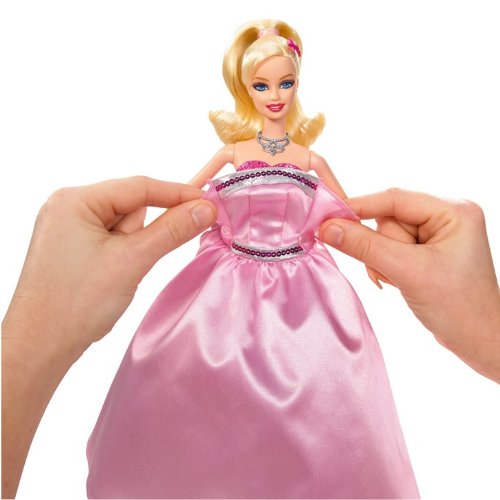 BARBIE TM A FASHION FAIRYTALE BARBIE® Doll: In the new movie, BarbieTM A Fashion Fairytale, Barbie® stars as herself in her famous fashion show outfit that transforms from a "princess gown" to a "party couture dress." With the press of a button, Barbie® doll's bodice magically lights up and is synchronized to music from the movie's fashion show finale. To transform the dress, fold down the top of "princess dress" and flip/turn skirt around to reveal the "party couture dress." Doll cannot stand alo