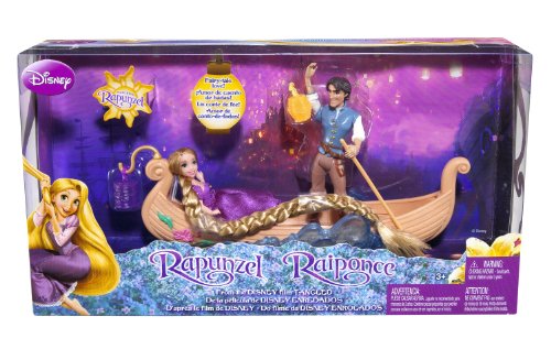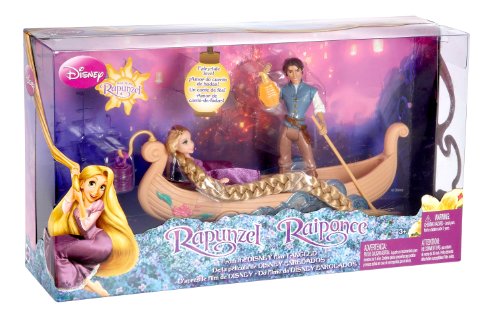 Disney Tangled Featuring Rapunzel Boat Ride Inspired by Disneys new animated feature film Tangled. Girls will want to relive the romantic movie moment when Rapunzel and Flynn Ryder fall in love and enjoy a magical gondola boat ride to see the lanterns, just like in Disneys new movie, Tangled. When girls push the wheeled boat, the waves on the side move up and down just like water. Includes gondola boat, Flynn Rider and Rapunzel dolls.