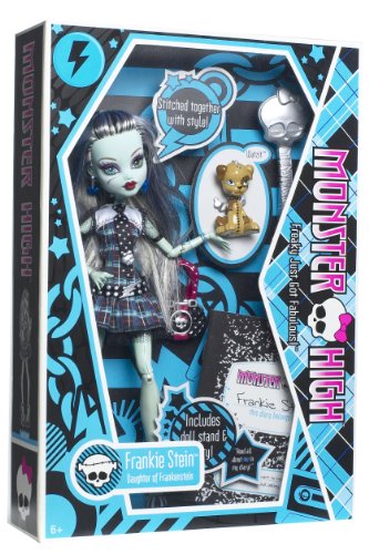 Monster High Frankie Stein Doll with Watzit Pet Frankie Stein is one of the coolest ghouls in school with her trendy fashions, accessories and scary cute pet Watzit. And she has very famous scary cool parents as well. Frankie Stein is the daughter of Frankenstein. Dollis fully articulated so she can be posed in many different ways. Includes 1 doll, pet, accessory, diary, brush, and doll stand.