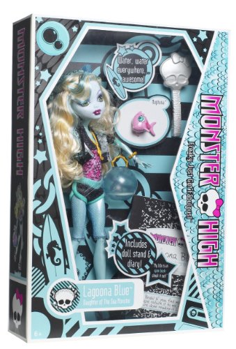 Monster High Lagoona Blue Doll with Neptuna Pet Goldfish Lagoona Blue is one of the coolest ghouls in school with her trendy fashions, accessories and scary cute pet pet goldfish. And she has very famous scary cool parents as well. Lagoona Blue is the daughter of the Sea Monster. Doll are fully articulated so she can be posed in many different ways. Includes 1 doll, pet, accessory, diary, brush, and doll stand.